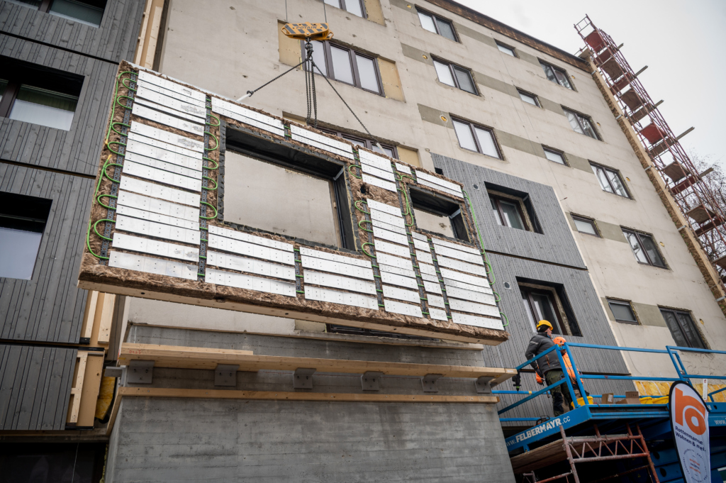 Die Module werden im Werk vormontiert und auf der Baustelle wie ein präzises Puzzle auf die Bestandsfassade gesetzt. Das Ergebnis: